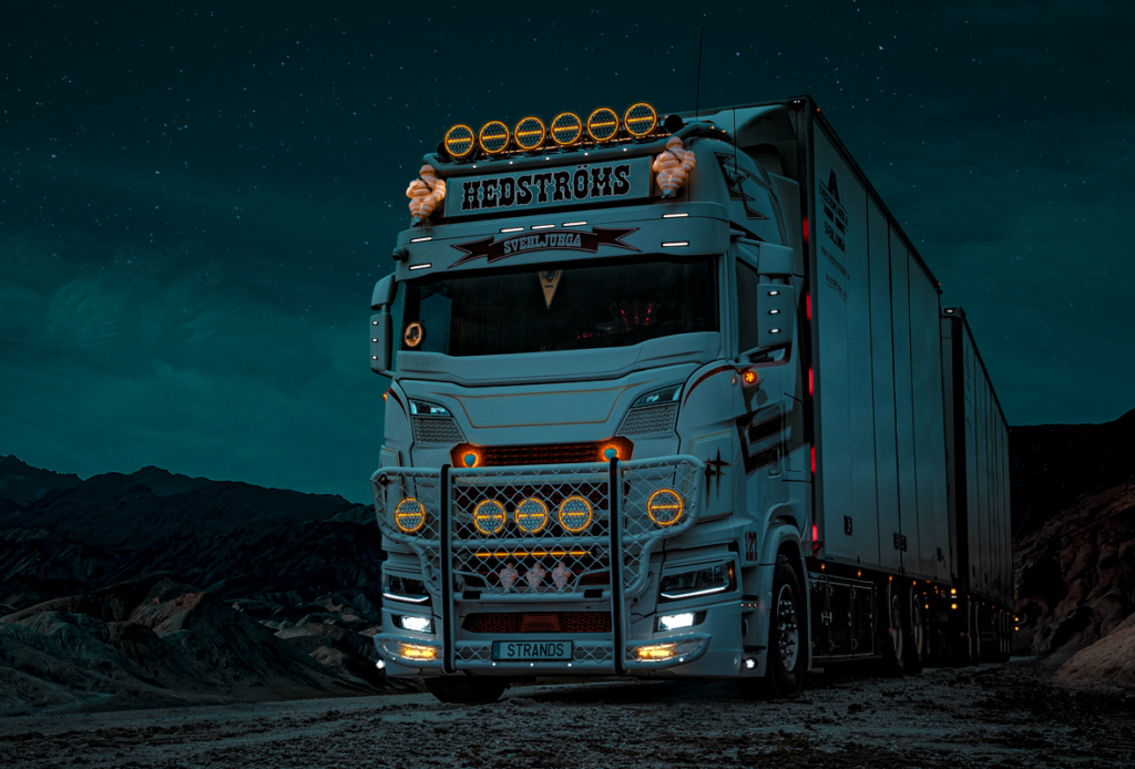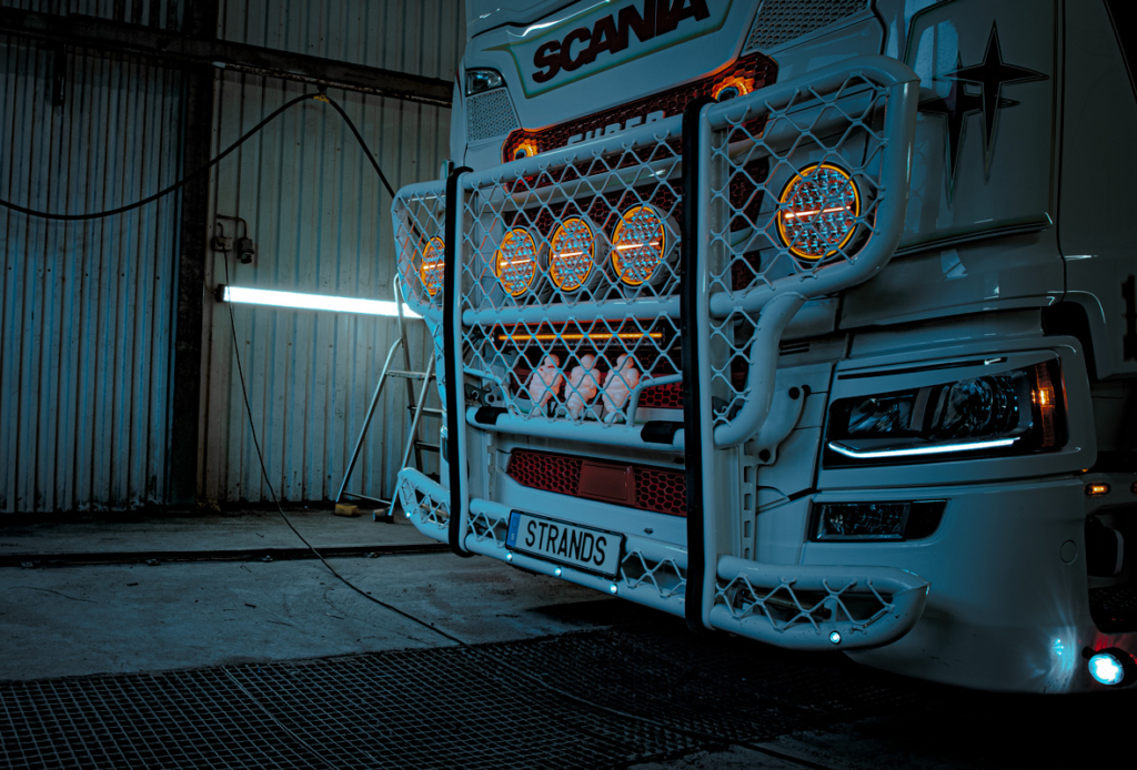 I fronten har jag Siberia Night Ranger 9” extraljus och Night Guard 32” LED-ramp med inbyggt blixtljus. Jag har Viking positionsljus och sidomarkeringar i olika färger och Strands DRL i gult glas. Bakåt har jag IZE LED bakljus, Dark Knight President arbetsljus och Siberia Red Tiger som backljus.